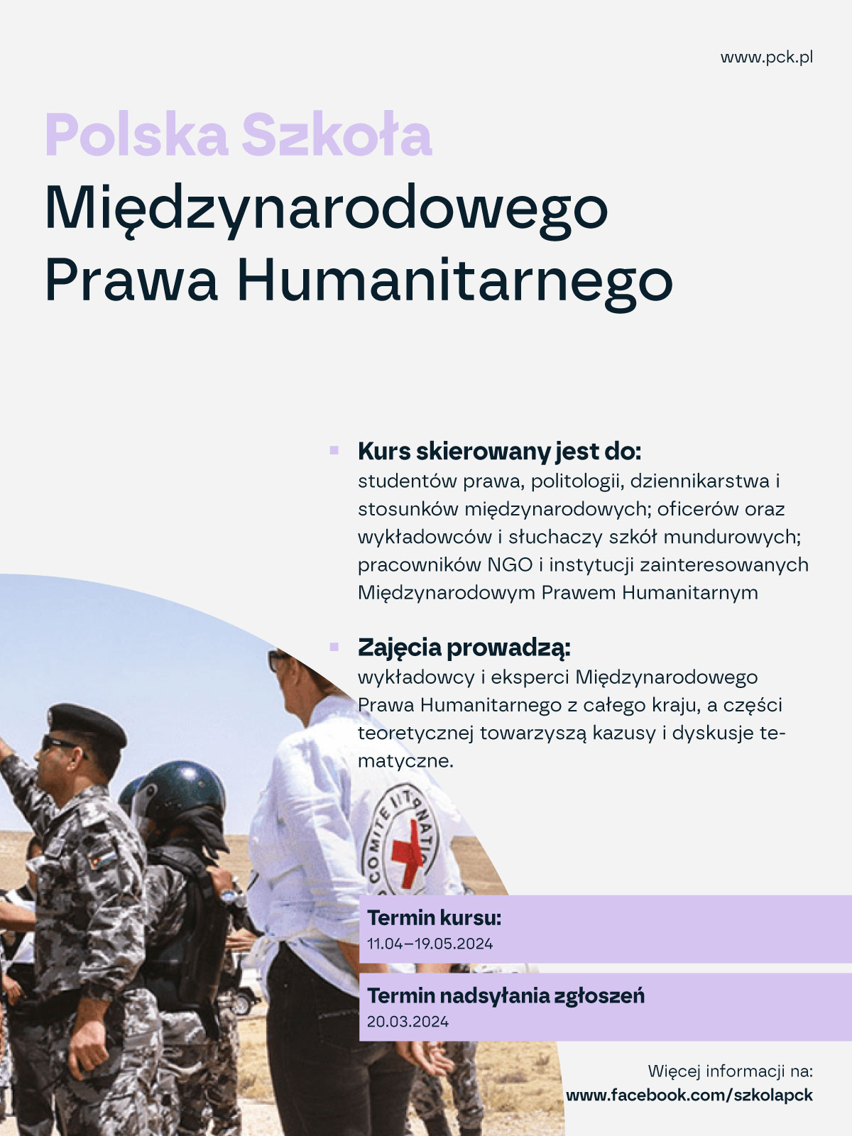 The Polish Red Cross is starting the recruitment for participation in the 26th edition of the School of International Humanitarian Law of Armed Conflicts. The course will take place from April 11 to May 19, 2024, in a hybrid format. The first four sessions will be held online from 3:00 PM to 6:15 PM on the following dates: April 11, April 18, April 25,