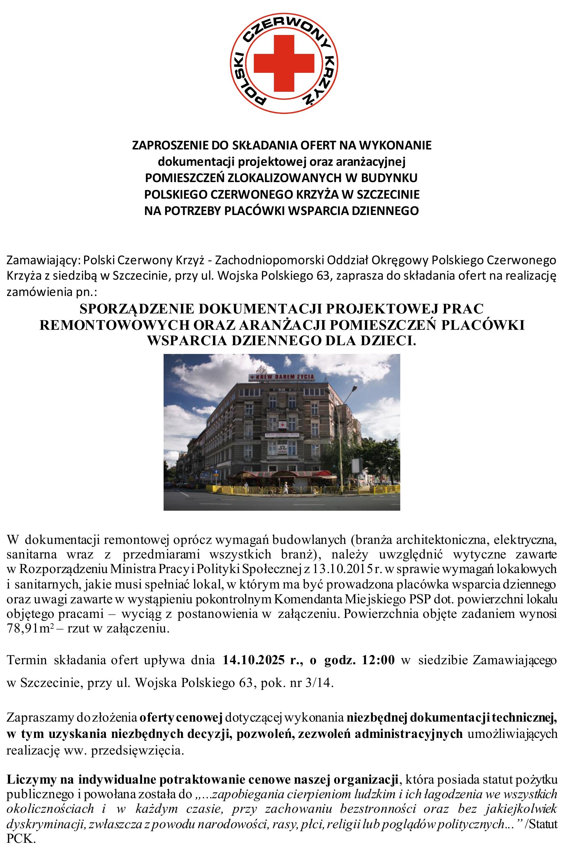 ZAPROSZENIE DO SKŁADANIA OFERT NA WYKONANIE dokumentacji projektowej oraz aranżacyjnej POMIESZCZEŃ ZLOKALIZOWANYCH W BUDYNKU POLSKIEGO CZERWONEGO KRZYŻA W SZCZECINIE NA POTRZEBY PLACÓWKI WSPARCIA DZIENNEGO
